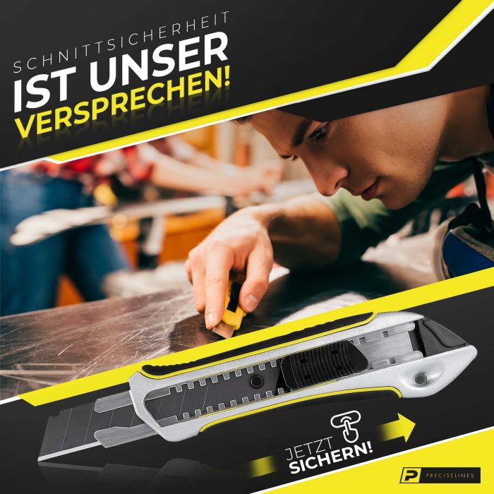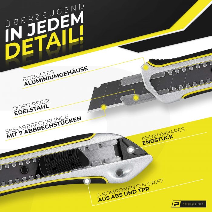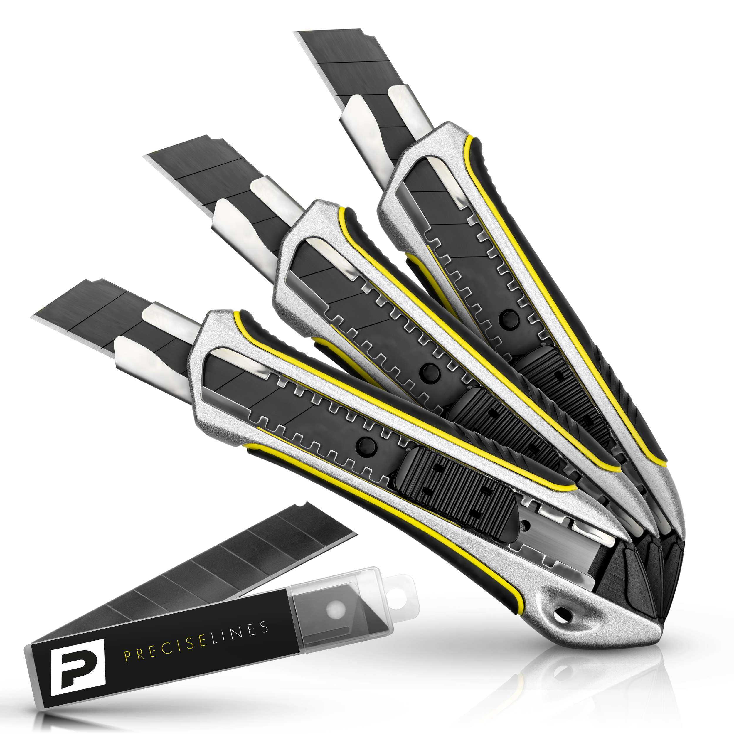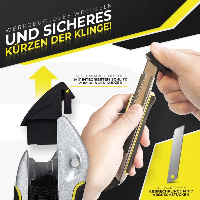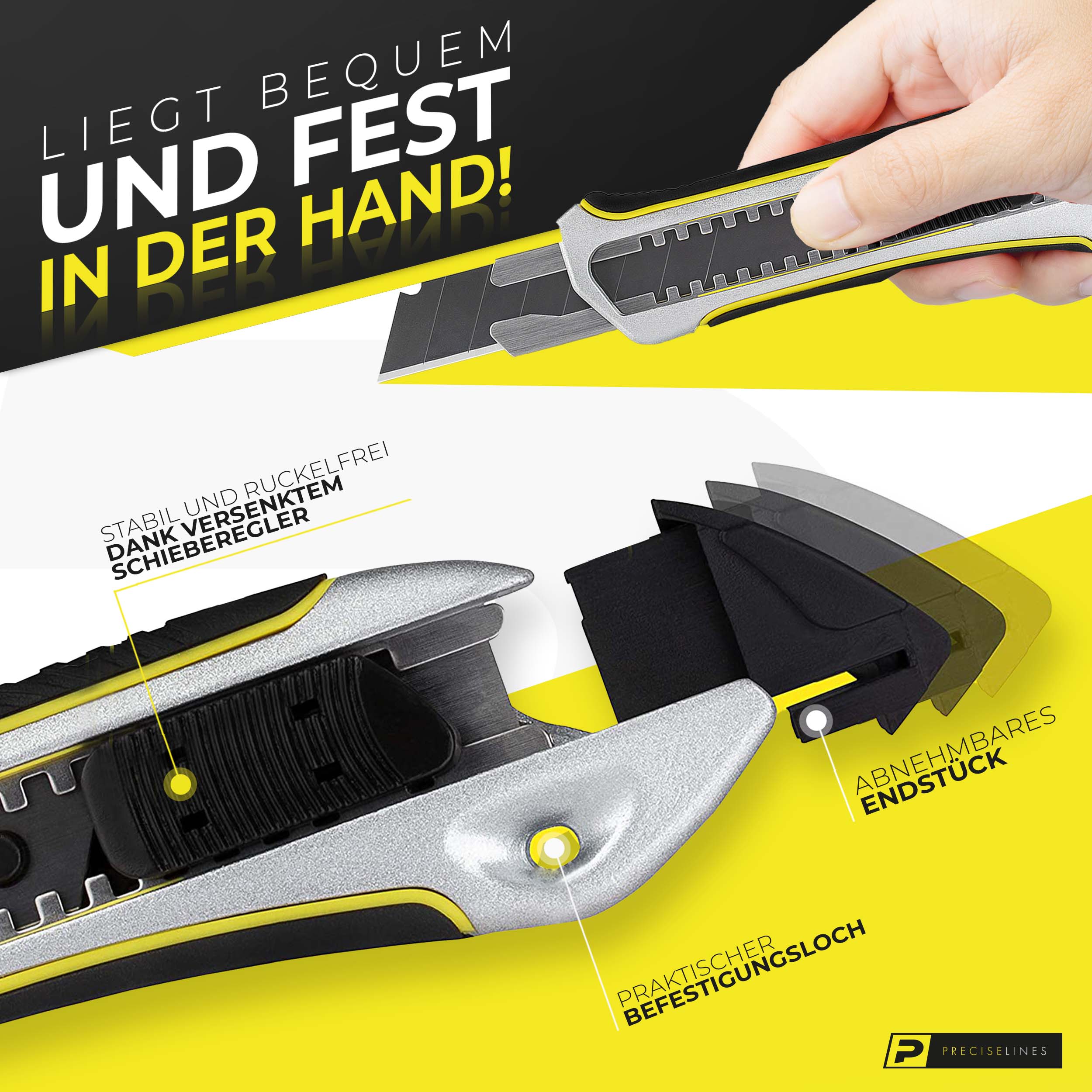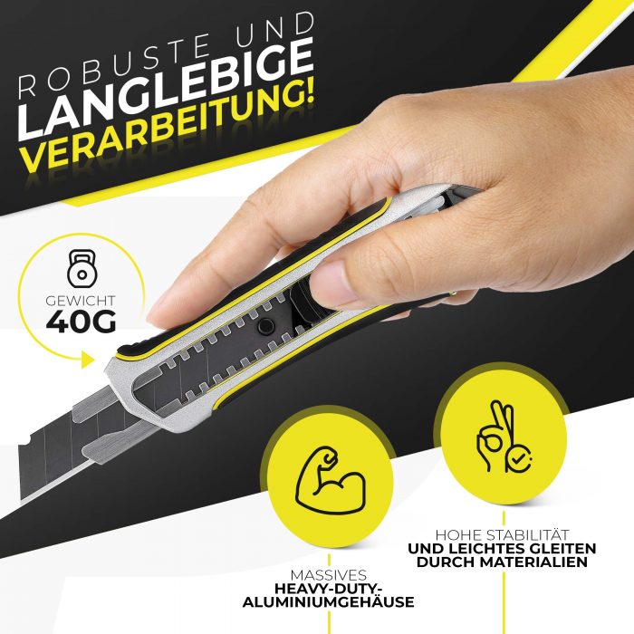 • SEHR SCHARF & OHNE SPIEL – Dank schwarz beschichteten SK5 Abbrechklingen mit 10 Ersatzklingen. Die Klingenführung aus rostfreiem Edelstahl mit extra Aluminiumstrebe sorgt dabei für zusätzliche Stabilität!